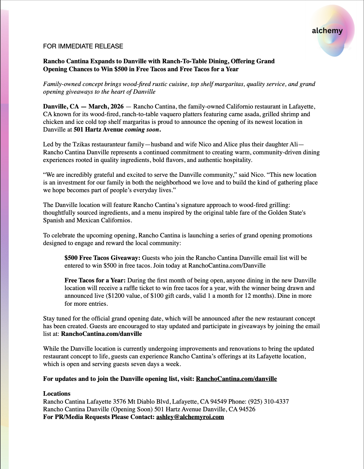 Join the Rancho Cantina Danville email list to be first to know about the official grand opening dates, plus anyone who subscribes will be automatically entered to win $500 in free Rancho Cantina tacos.